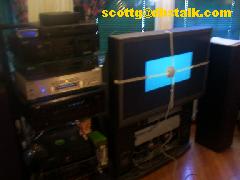 Gregg is busy restacking my screenThe day rolled around and Gregg promptly arrived at 10am.  A quick look at my setup and I could tell that Gregg was impressed with my setup.  I know that he has worked on much better setups then mine, but I think he liked how I had it setup.  He grabbed a quick handfull of fresh popcorn from my popcorn machine and went to work.  The first thing he did was get his cordless screwdriver and removed my screen and the front grill. Next he put his hands under the set and disable the SVM circuit by pulling some wires from the circuit board.  He then covered the wire ends with electrical tape to make sure the wires shorted nothing out.